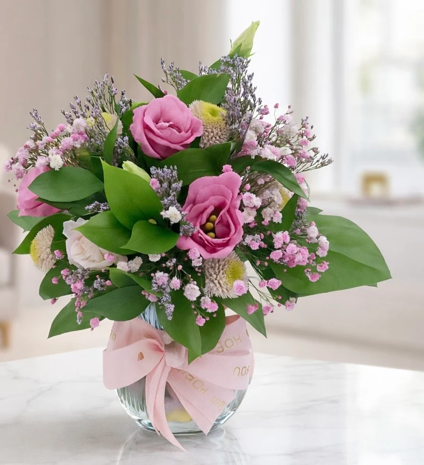 يتميز ترتيب إناء الزهور الصغير الساحر هذا بإستوما ناعمة وجبسوفيليا وليمنيوم رقيقة، مع لمسة من زهرة جريسانيوم واحدة و ريكو ناعمة.