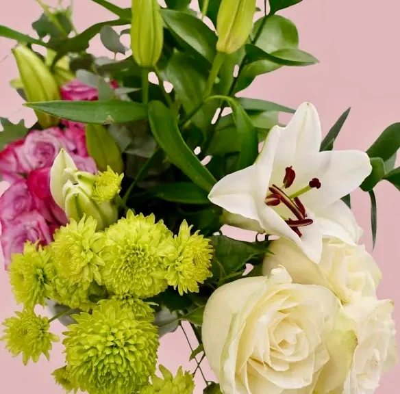 احتفل ببدايات جديدة! تجمع باقة ترحيب بالمعجزة ورودًا بيضاء مع ورود بنفسجية جميلة وزهور كازابلانكا. مثالية للتهنئة أو المولود الجديد.