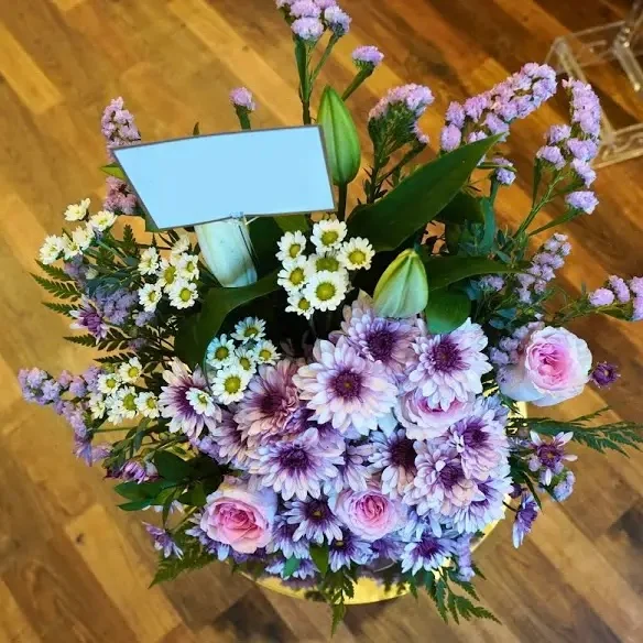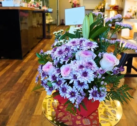 هذه باقة جميلة جدًا مكونة من زهور باللون البنفسجي الفاتح والوردي، موضوعة داخل صندوق وردي صغير مزخرف بقلب ذهبي.