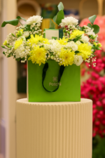 السحر الأزرق – القاعدة أكريليك تحتوى زهور الأقحوان مع الجيبسوفيلا وأغصان خضراء وذهبية