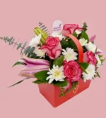 دلل شخصًا مميزًا بهذه السلة الهدية الفاخرة. تتشابك زهرة كازابلانكا المهيبة مع أوكالبتوس الناعم والأقحوان الملونة والخضرة المورقة. تُنهى بسعفين من سرخس الجلد لمسة من الأناقة.