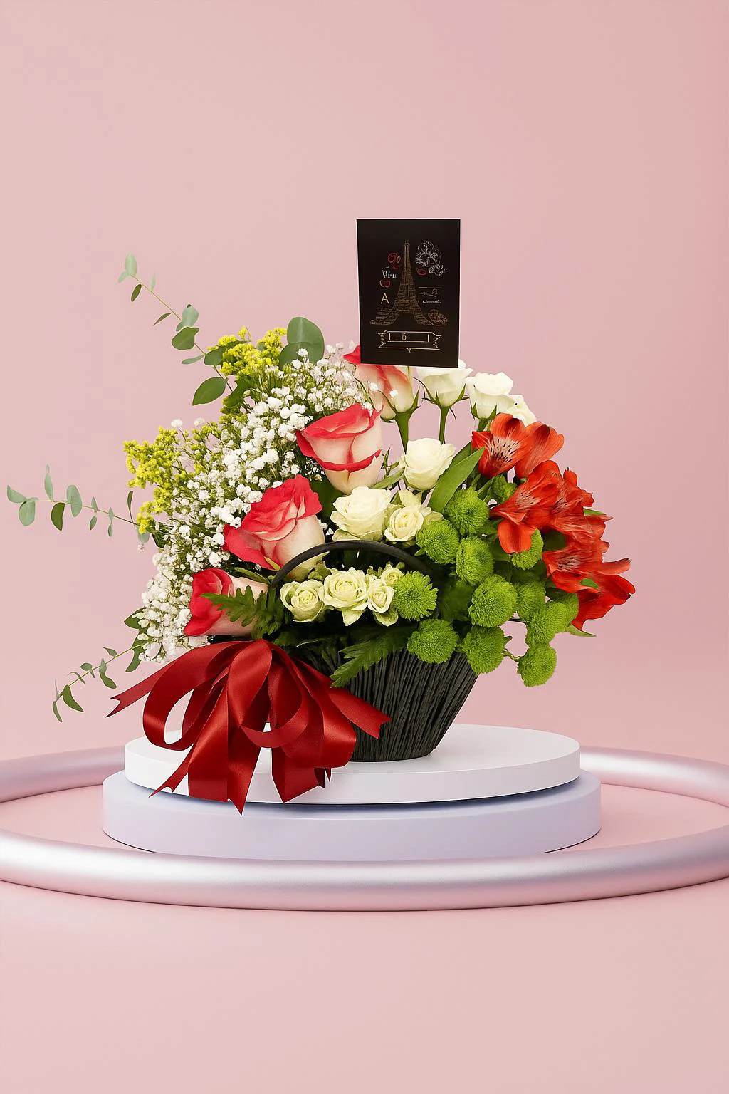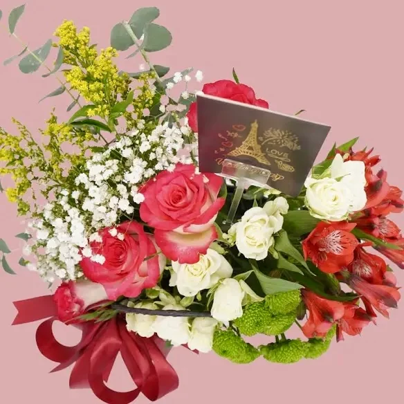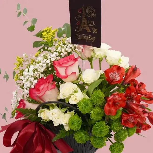 سلة تجمع بين الرومانسية والأناقة، بتنسيق يمزج بين الورود الحمراء والبيضاء التي تحكي قصة حب، مع لمسة من الأوراق الخضراء المنعشة وزهرة الألستروميريا البرتقالية التي تضفي حيوية وسعادة.