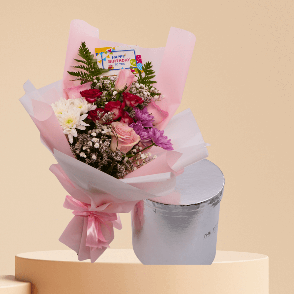 يكمّل الغلاف الوردي مزيجًا من الورود والأقحوان والليمونيوم. تضيف ورود البيبي الرقيقة والجيبوفيليا وسرخس الجلد لمسة من الغرابة.