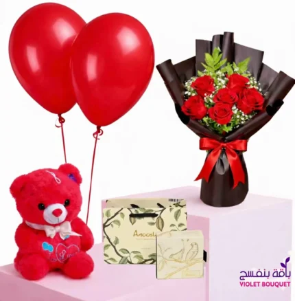 ماذا يحتوي هذا التنسيق؟• باقة ورد جوري فاخرة: ورود حمراء نضرة مغلفة باللون الأسود الملكي لتعبر عن الرقي والاهتمام.• مع شوكلاتة فيريرو روشيه ١٦ قطعة او شوكلاتة أنوش البلجيكية الفاخرة خصيصاً لتضفي لمسة حلوة على الاحتفال.• دبدوب الحب اللطيفلماذا تختار هذا المنتج؟1. توفير للوقت: جمعنا لك كل عناصر الاحتفال في منتج واحد.2. تنسيق احترافي: ألوان متناغمة تعكس ذوقك الرفيع.3. جاهز للتقديم: يصلك بتغليف أنيق وجاهز للمفاجأة فوراً.💡 لا تنتظر طويلاً.. الحب يُهدي ولا يُؤجل!