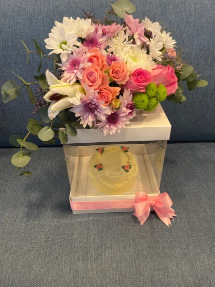 صندوق السحر / بوكس شفاف داخله كيك مع زهور الجوري مع كازابلانكا والاقحوان ولمسات من أوراق الأوكالبتوس