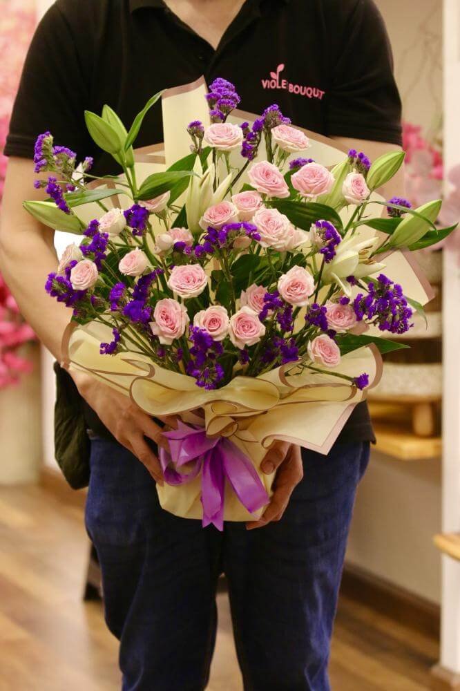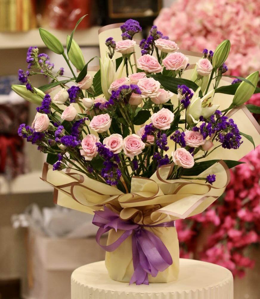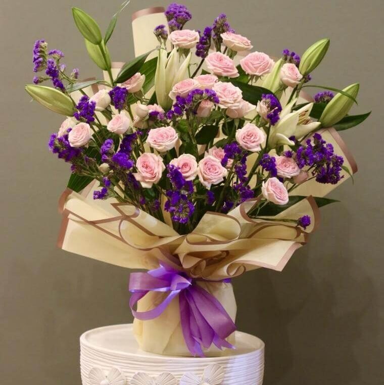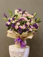 بسمة مشرقة – باقة ورد وردية بلمسات ليمونيوم وليليوم ناعمة