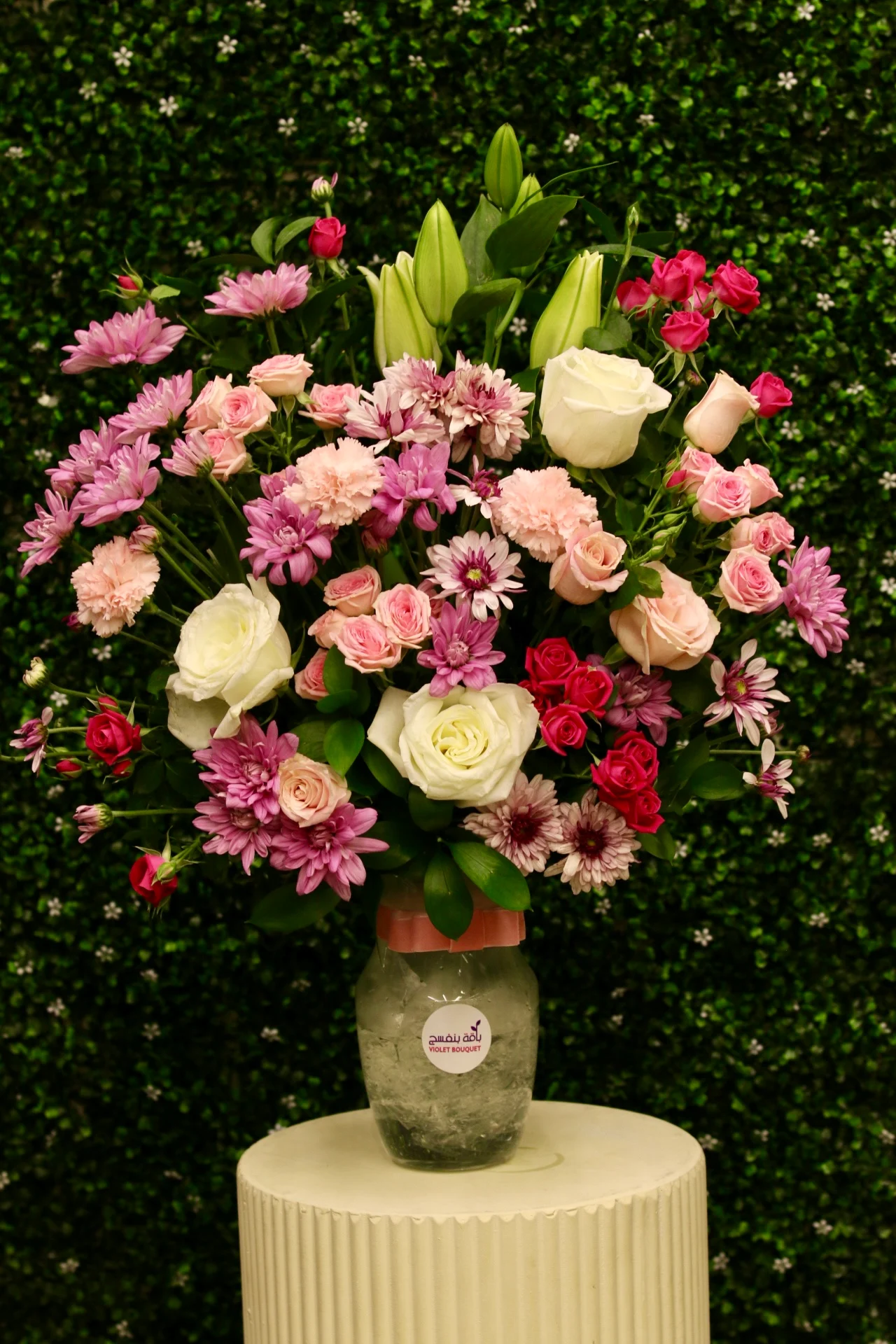 الرئيسية » المتجر » مزهرية فاخره بالورود البيضاء والوردية