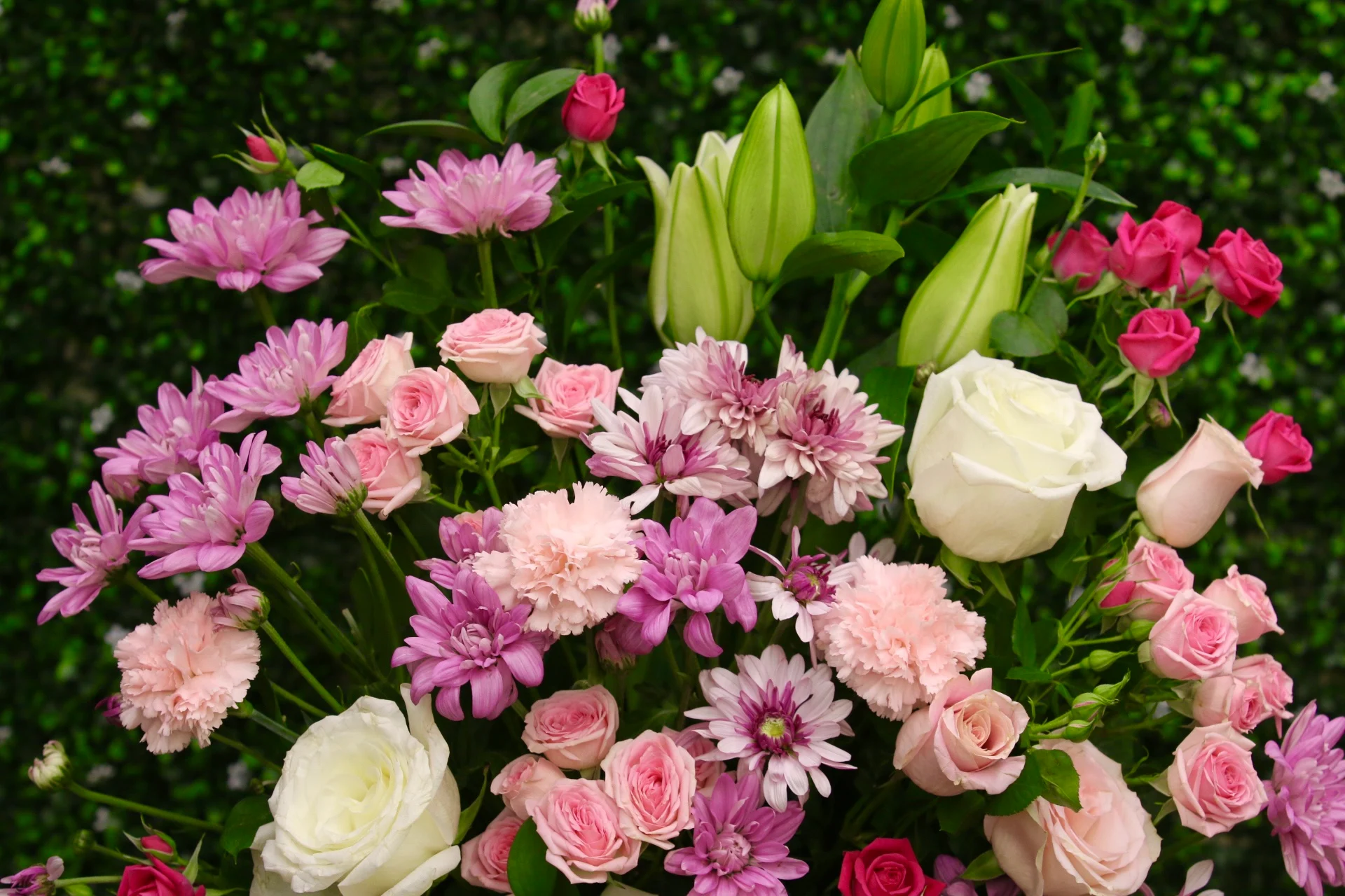 • زهور منوعة: تحتوي على أنواع مختلفة مثل الورود، والقرنفل، وزهور الأقحوان، مما يجعلها غنية بالتفاصيل.