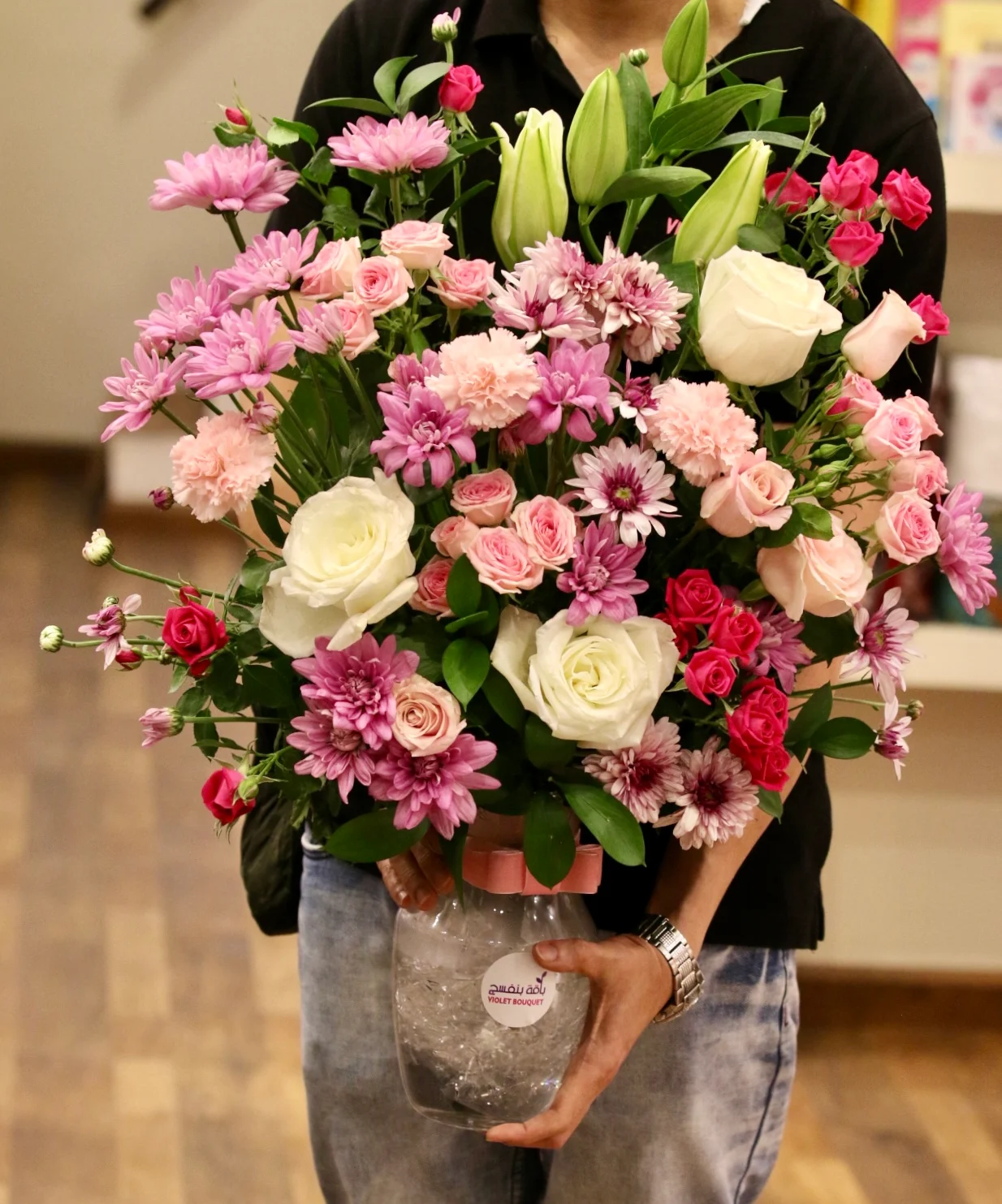 تتكون هذه الباقة من مجموعة متنوعة من الزهور الطبيعية بألوان البنفسجي، الوردي، والأبيض، مما يمنحها إطلالة حيوية وجذابة.