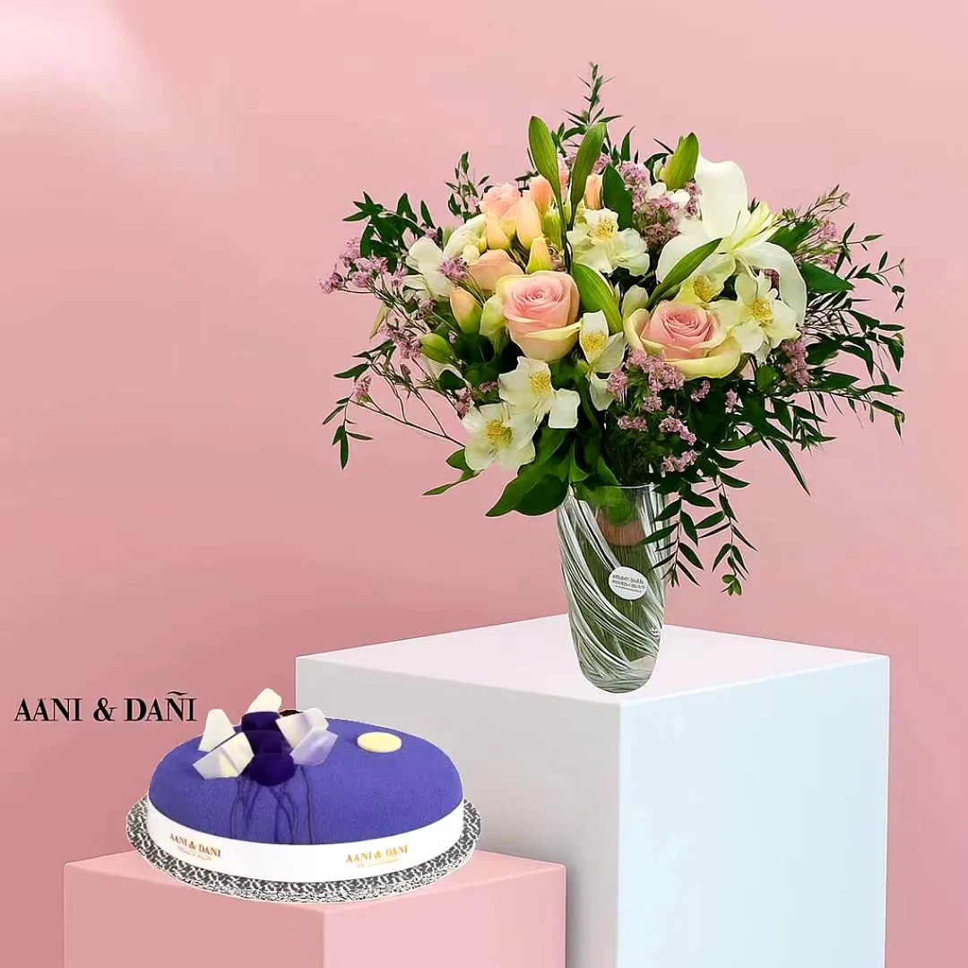 تتكون هذه الباقة من مجموعة متنوعة من الزهور الطبيعية بألوان البنفسجي، الوردي، والأبيض، مما يمنحها إطلالة حيوية وجذابة.