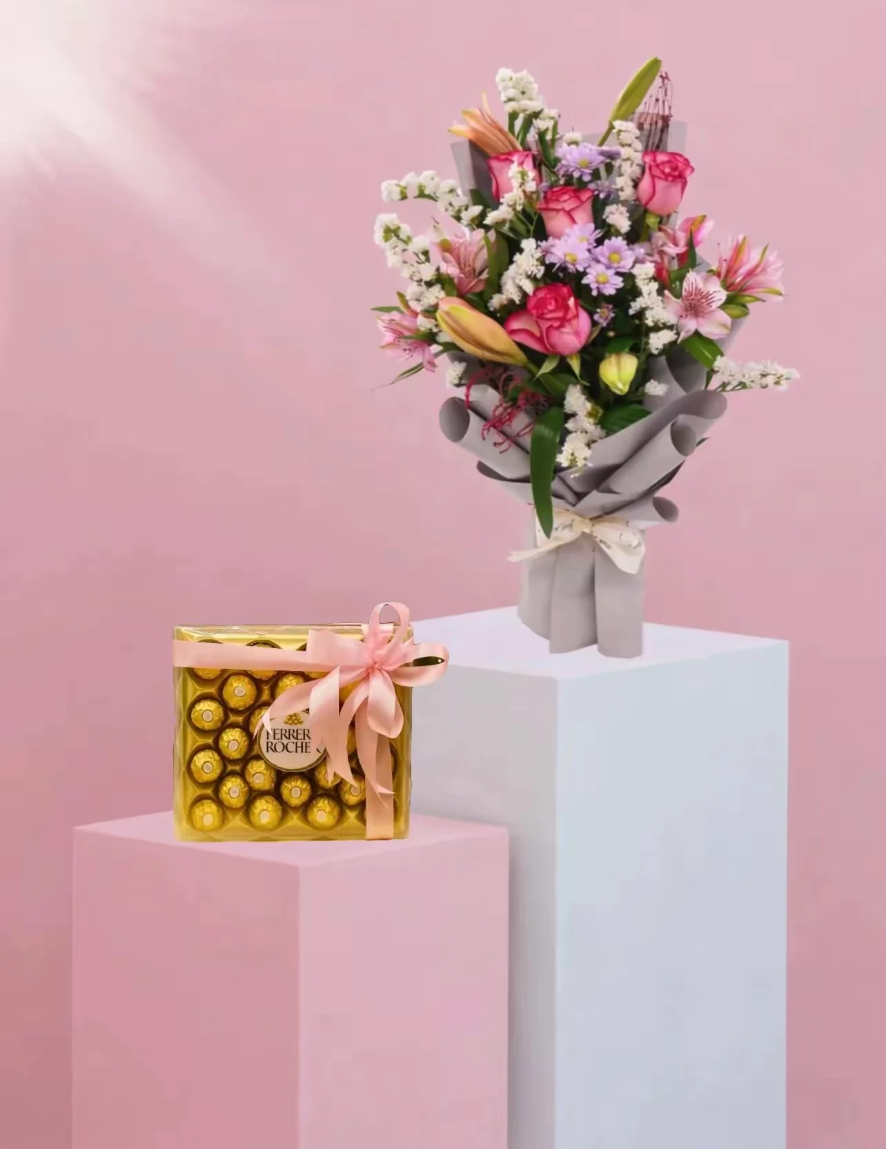 اهدي من تحب هده الباقة الرقيقة من بيبي روز وردية مصحوبة بشوكولاتة فيريرو او باتشي