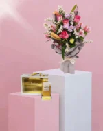 تجمع هذه الباقة الأنيقة بين الجمال الخالد ولمسة من الغرابة. تخلق الورود الوردية الكلاسيكية وزنابق كازابلانكا قاعدة راقية، بينما تضيف الأستريوميا المرحة والأقحوان انفجارًا من الألوان. مع لمسة من ستاتيس لإضفاء لمسة من القوام، إنها اختيار ساحر لا يُنسى.