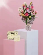 دلل نفسك بالرومانسية مع هذه الهدية الساحرة. باقة رقيقة من ورود البيبي الوردية والبيضاء معروضة بشكل جميل في صينية شفافة، مدعومة بعلبة شوكولاتة أنوش كراميل المميزة. هذا المزيج الرائع يخلق تجربة ساحرة لا تُنسى