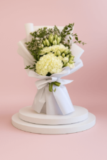 • تغليف فاخر: تأتي الباقة مغلفة بورق وردي ناعم "مات" يبرز لون الزهور، مع لمسة نهائية من شريط ساتان أبيض يضفي طابعاً كلاسيكياً أنيقاً.
