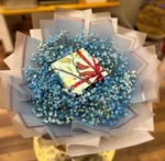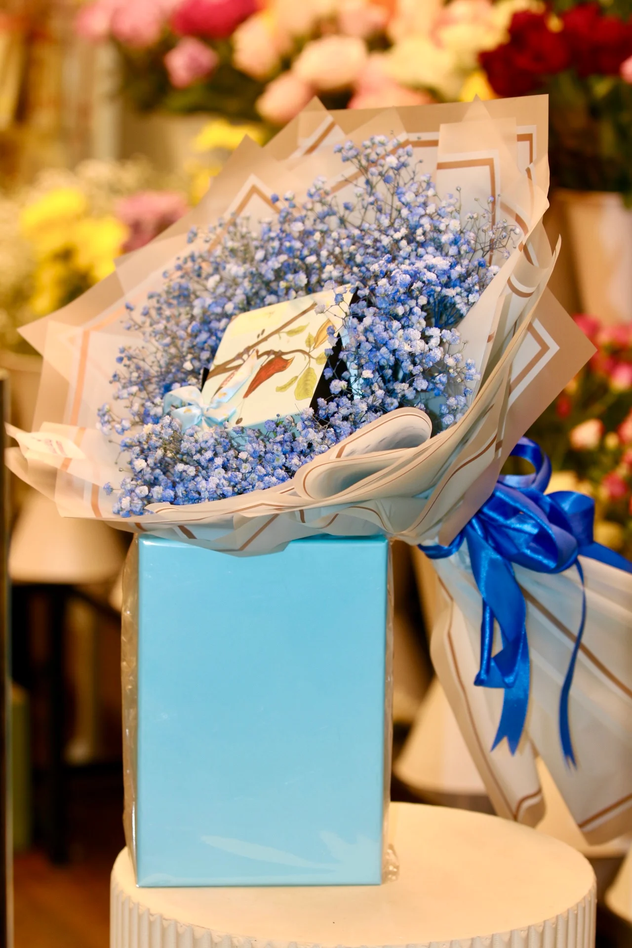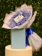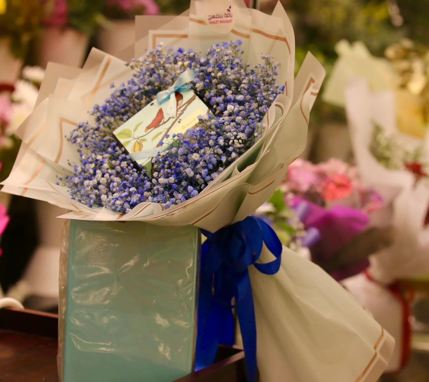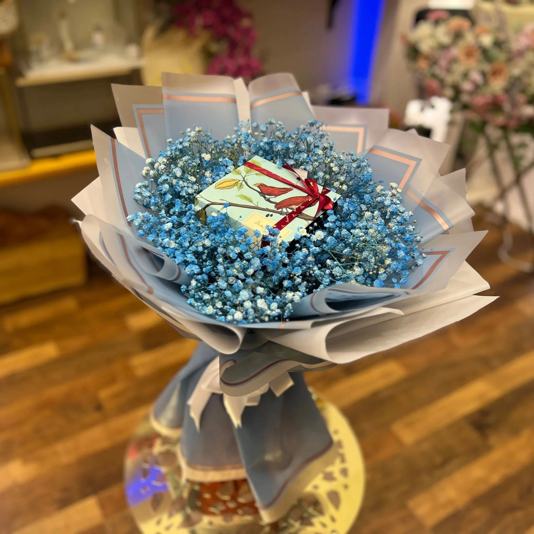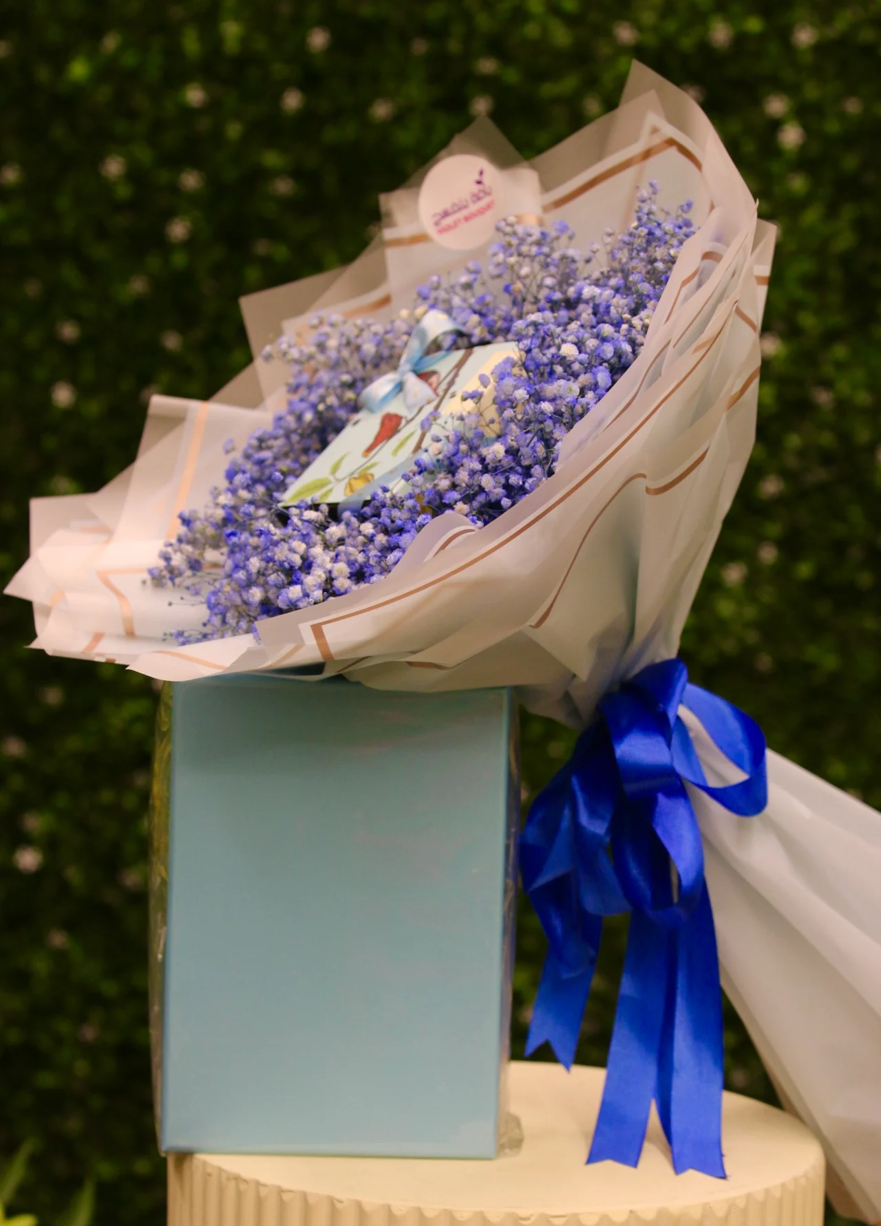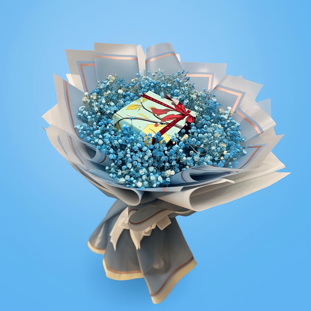 اكتشف الهدوء مع هذه المجموعة المريحة. باقة رقيقة من الجبسوفيليا الزرقاء، رمز السلام والهدوء، تتناغم بشكل مثالي مع علبة شوكولاتة أنوش الفاخرة. هذا المزيج المهدئ يخلق هدية مثالية للاسترخاء والتجديد