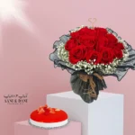 باقة المشاعر/ صندوق شفاف يحتوى على الورد الجوري الأحمر والكيك اروى صغير