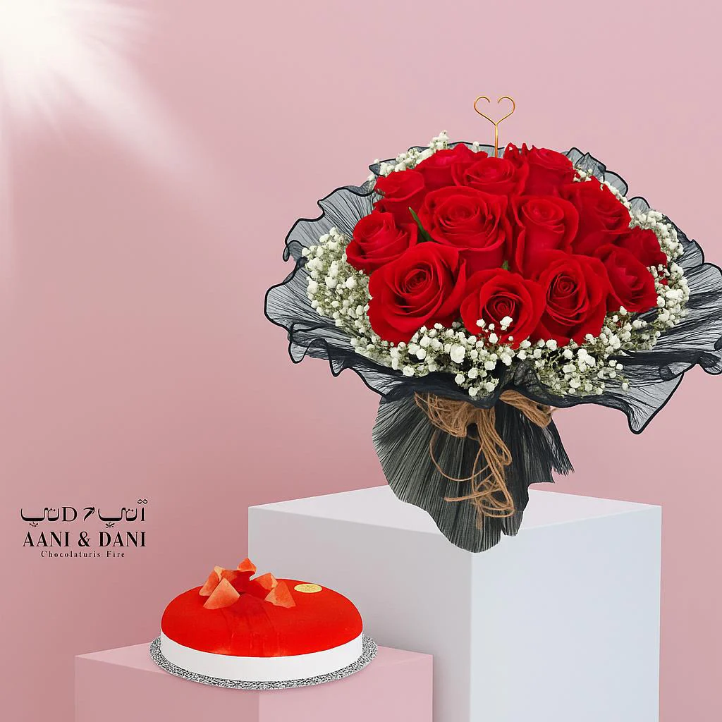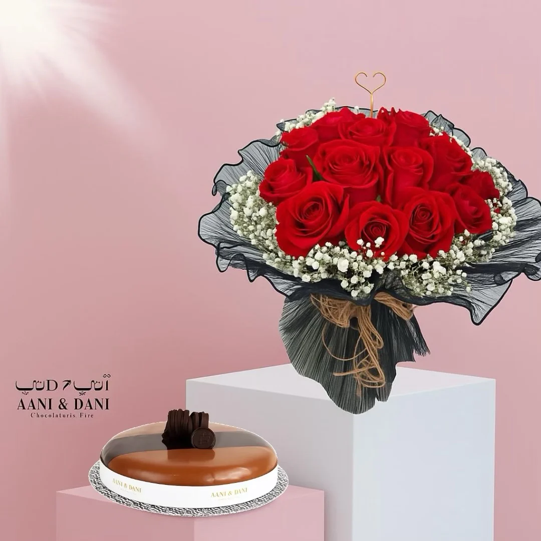 باقة الحب الأبدي – باقة ورد طبيعي مع ورد وردي وأقحوان أبيض مع كيكة أني داني الصغيرة