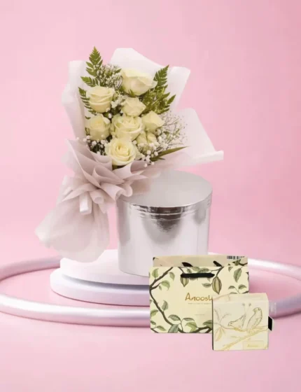 باقة أناقة بيضاء – بوكيه ورد أبيض ناعم لهدية مميزة